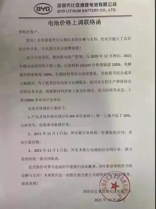 深圳市比亚迪锂电池有限公司电池价格上调联络函尊敬的客户:您好!非常感谢贵司长期以来的信赖与支持,使双方建立了良好的合作关系,在此我司表示深挚谢意!由于市场变化,叠加限电限产影响,与2020年12月相比,2021年锂电池原材料不断上涨,正极材料LiCoO2价格涨幅超200%,电解液价格涨幅超150%,负极材料等供应持续紧张,导致我司综合成本大幅提高。为了能更好的为贵司长期服务,协同双方的生产和保持良好的业务关系,根据原材料价格上涨实际情况,我司经研究决定,上调C08M等电池产品单价。电池具体调价方案如下:1、产品含税价格在现行的Wh单价基础上,统一上涨不低于20%,具体型号、价格参考新报价单:2、2021年11月1日起,所有新订单将统一签署新的合同,并执行新价格;3、2021年11月1日起,所有未执行完成的旧合同订单,我司系统将统一做关闭取消。此次涨价对贵司造成的不便C17官方深表歉意,同时希望得到贵司的谅解与支持!未来我司会一如既往地为贵公司提供优质产品与服务。顺祝商祺!深圳市比亚迪锂电池有限公司2021年10月25日