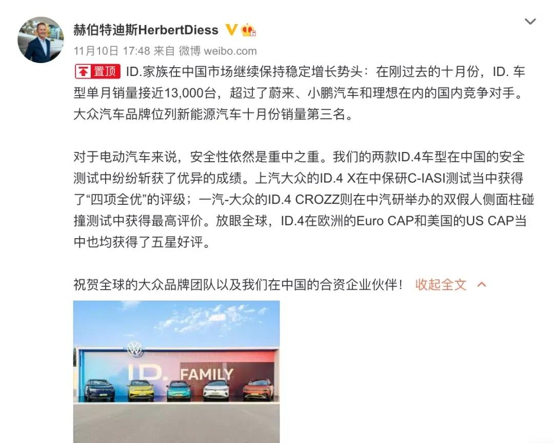 据了解,大众旗下的德国工厂有茨维考工厂和德累斯顿工厂。而茨维考工厂主要负责生产大众ID.3、ID.4、奥迪Q4 e-tron和Cupra Born等车型。值得注意的是,早几日,大众汽车集团迪斯在社交平台发文表示,ID.家族在中国市场继续保持稳定增长势头,十月ID.车型单月销量为12376台,超过蔚来、小鹏汽车和理想等国内竞争对手。不能看出此次停产,也将导致这些车辆供应在短时间内受到限制。